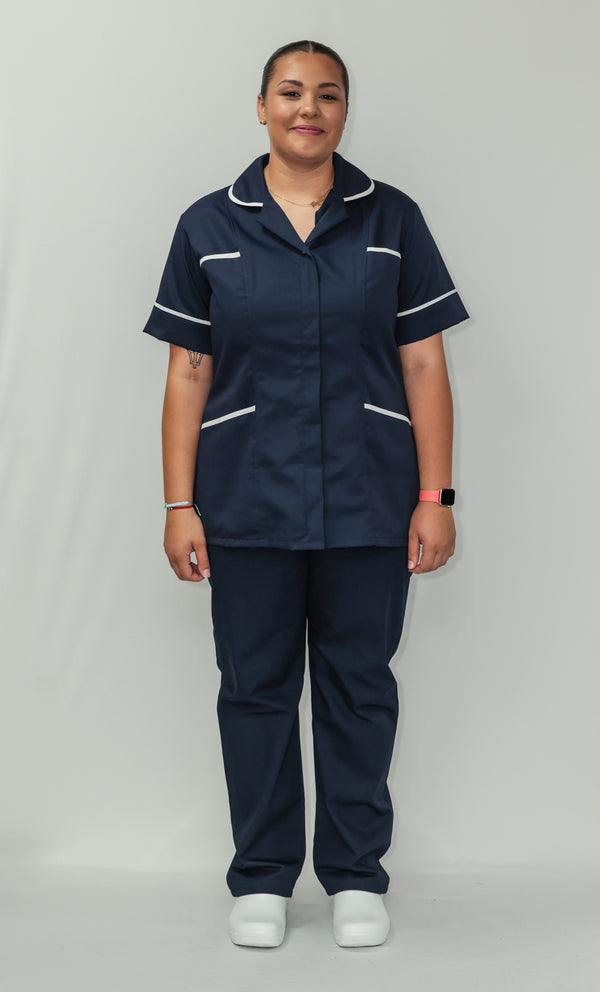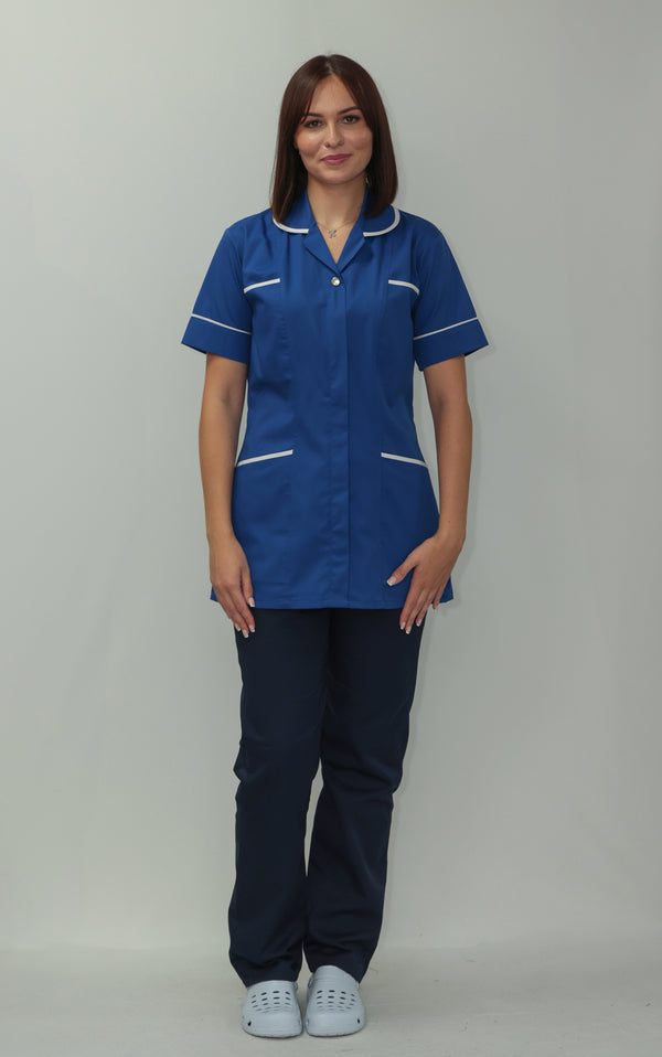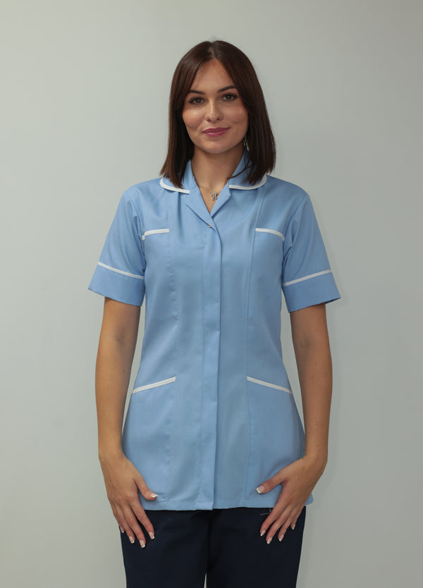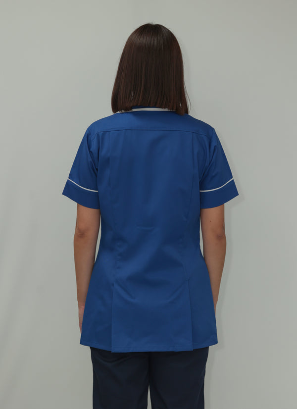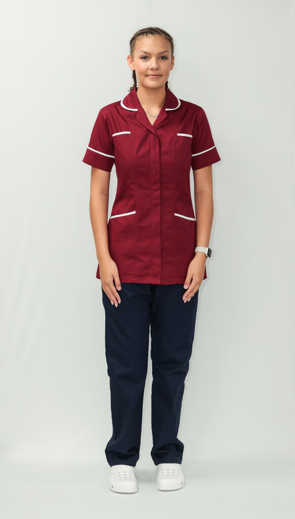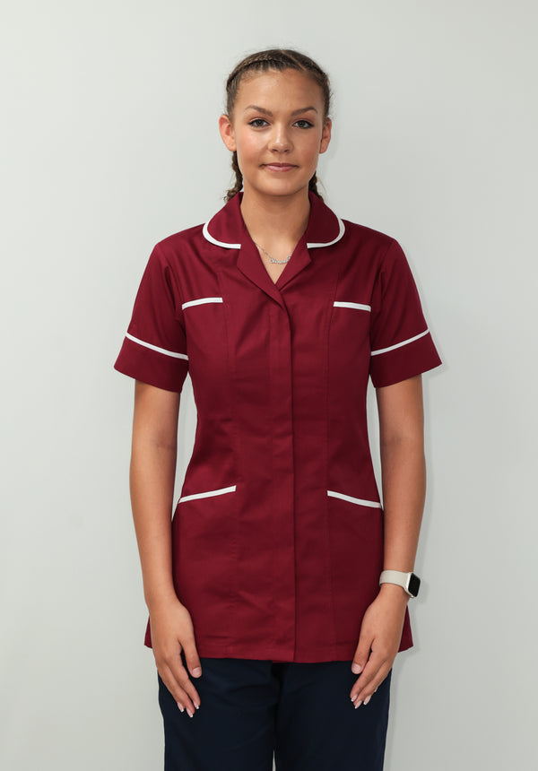 This female healthcare tunic is designed for durability, comfort, and sustainability, making it an ideal choice for professionals in demanding environments. This tunic is made from 65% Post-Consumer PET Polyester and 35% Organic Cotton and has a zip and popper closure. Made to withstand vigorous industrial washing and is suitable for home washing, this tunic can endure 2,000 washes up to 75° C for a 4-year life span, during which any issues will be replaced free of charge. Available in Maroon, Light Blue, Royal Blue, and Navy Blue with White Piping, it comes in sizes 6 to 24 to suit a range of body types. Designed with functionality in mind, it features two chest pockets and two hip pockets, providing efficient storage for everyday essentials. Additionally, this tunic holds a carbon credit value, and at the end of its life, we buy it back so it can be recycled again.