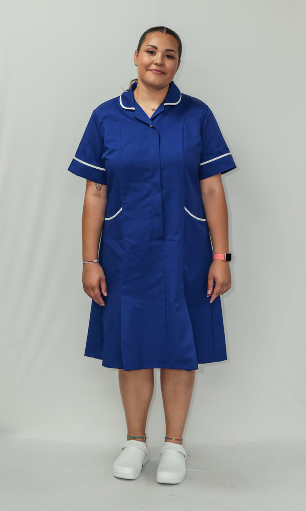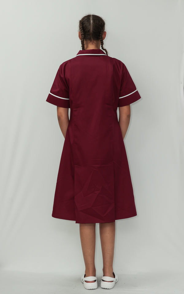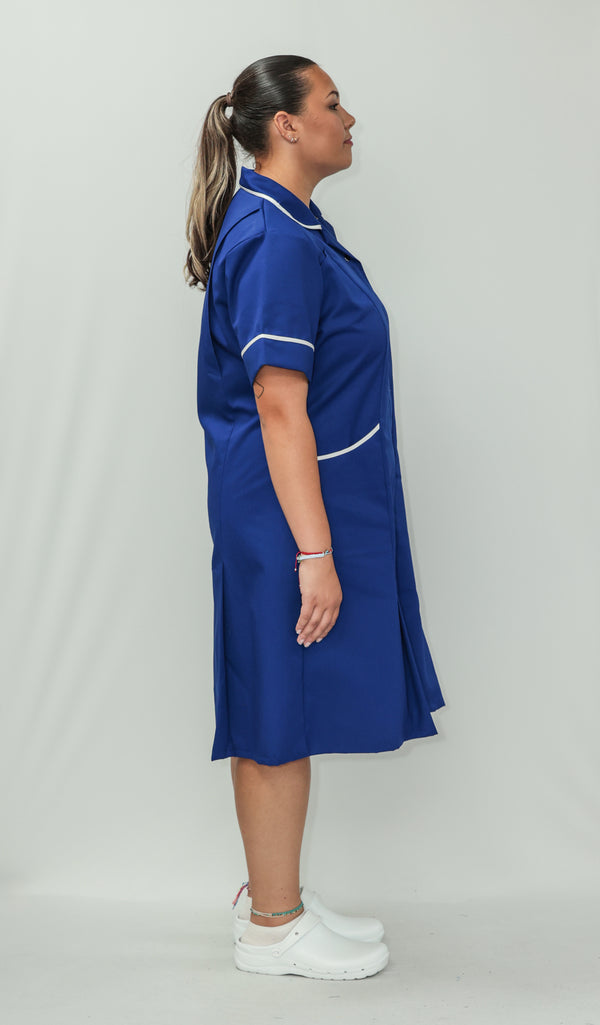 This women’s dress, made from a lightweight yet durable fabric blend of 65% post-consumer PET and 35% organic cotton, provides excellent breathability. Designed for longevity, this dress is guaranteed for 2,000 washes and can withstand washing temperatures of up to 75°C, ensuring long-term hygiene and freshness. With a 4-year lifespan, it delivers outstanding durability without sacrificing quality. The dress features a zip and silver popper fastening, allowing for easy wear and a secure fit, while a chest pocket and two spacious hip pockets offer practical storage for essentials. Finished with elegant white piping along the collar and sleeves, this dress brings a professional yet modern look to everyday workwear. It's available in Maroon, Light Blue, Royal Blue, and Navy Blue. It comes in sizes 6–24 to ensure a flattering and comfortable fit for all. As part of our sustainability commitment, this product has a carbon credit value and we also offer a buy-back program at the end of its life, allowing the dress to be recycled.